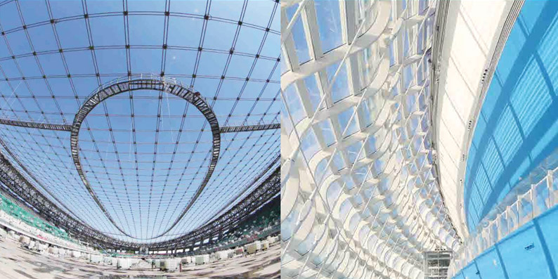 建筑之美:以“冰”和“速度”为设计象征,冰丝带由3360块曲面和平板玻璃组成的透明立面晶莹剔透,从设计理念、技术工艺、材料选取、施工技法等方面实现了创新和突破。如“198米长、124米宽的世界最大跨度单层正交双向马鞍形屋顶索网”,“22根冰丝带环绕曲面幕墙”等,体现了绿色、环保、智慧等建筑亮点。