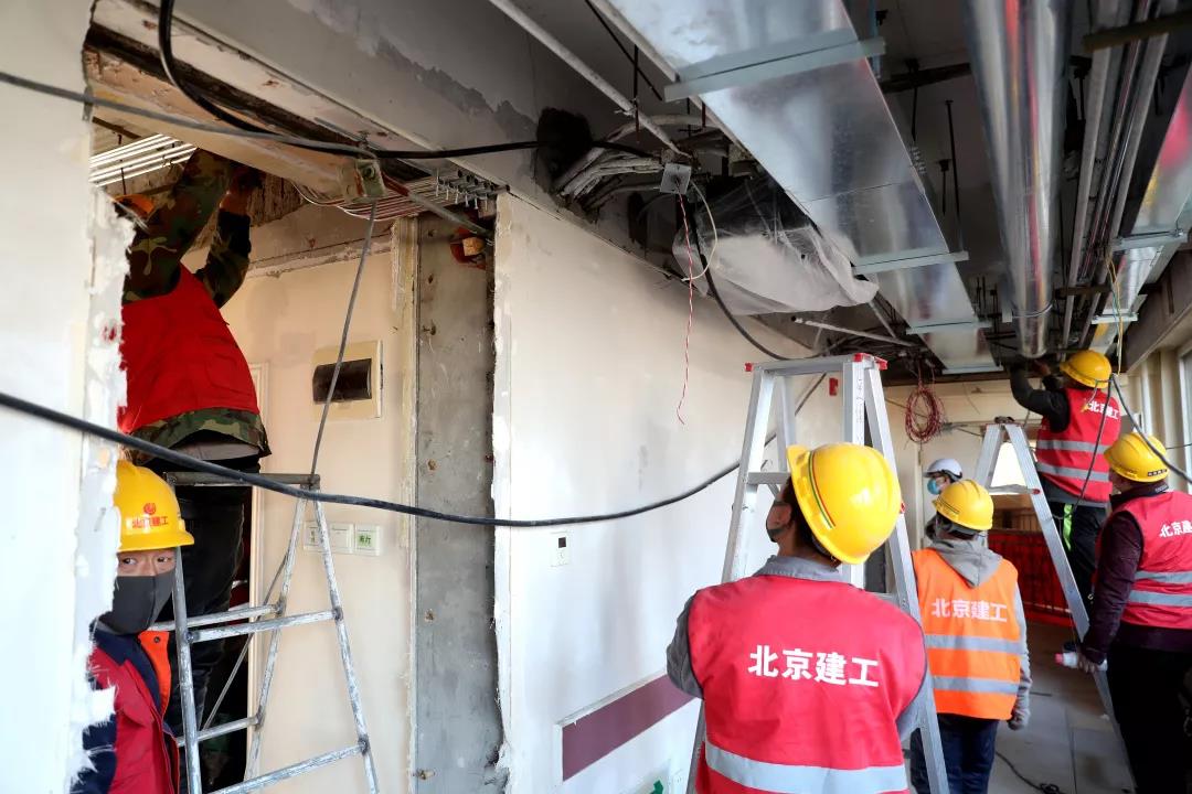 大年三十和正月初一,建工集团京内各留守项目部调集人员全力开始工程建设。城建集团停下正在进行装修改造的城建科技大厦工程,将所有工人全部派往小汤山医院。