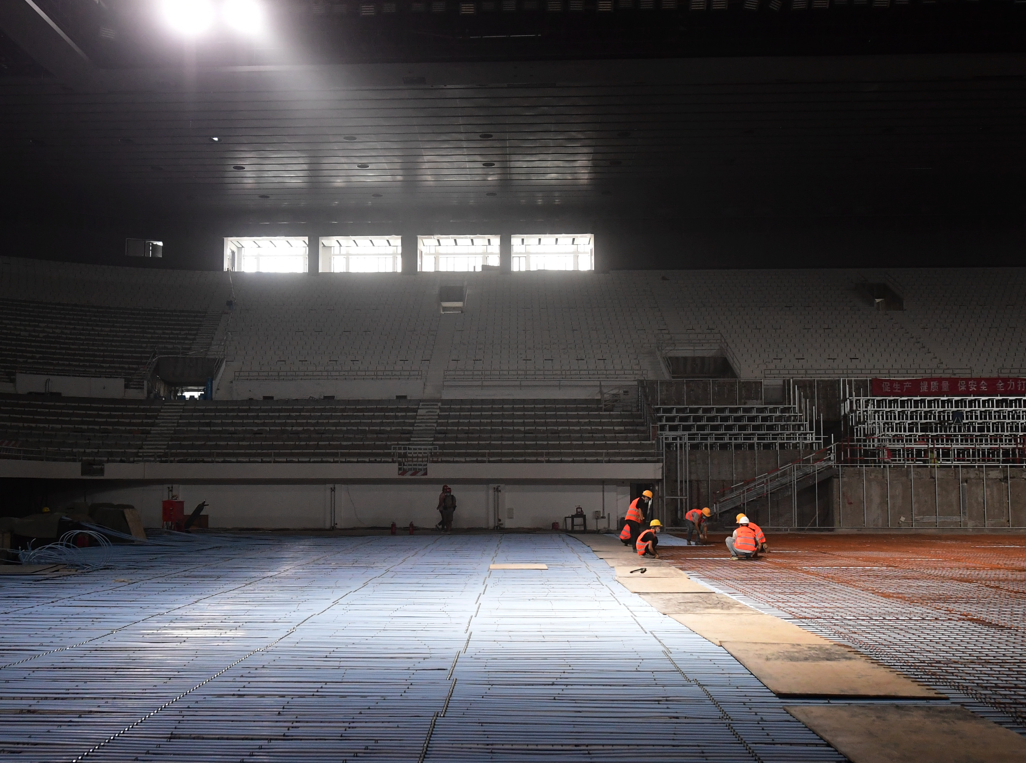 工人在首都体育馆内施工。新华社记者张晨霖摄