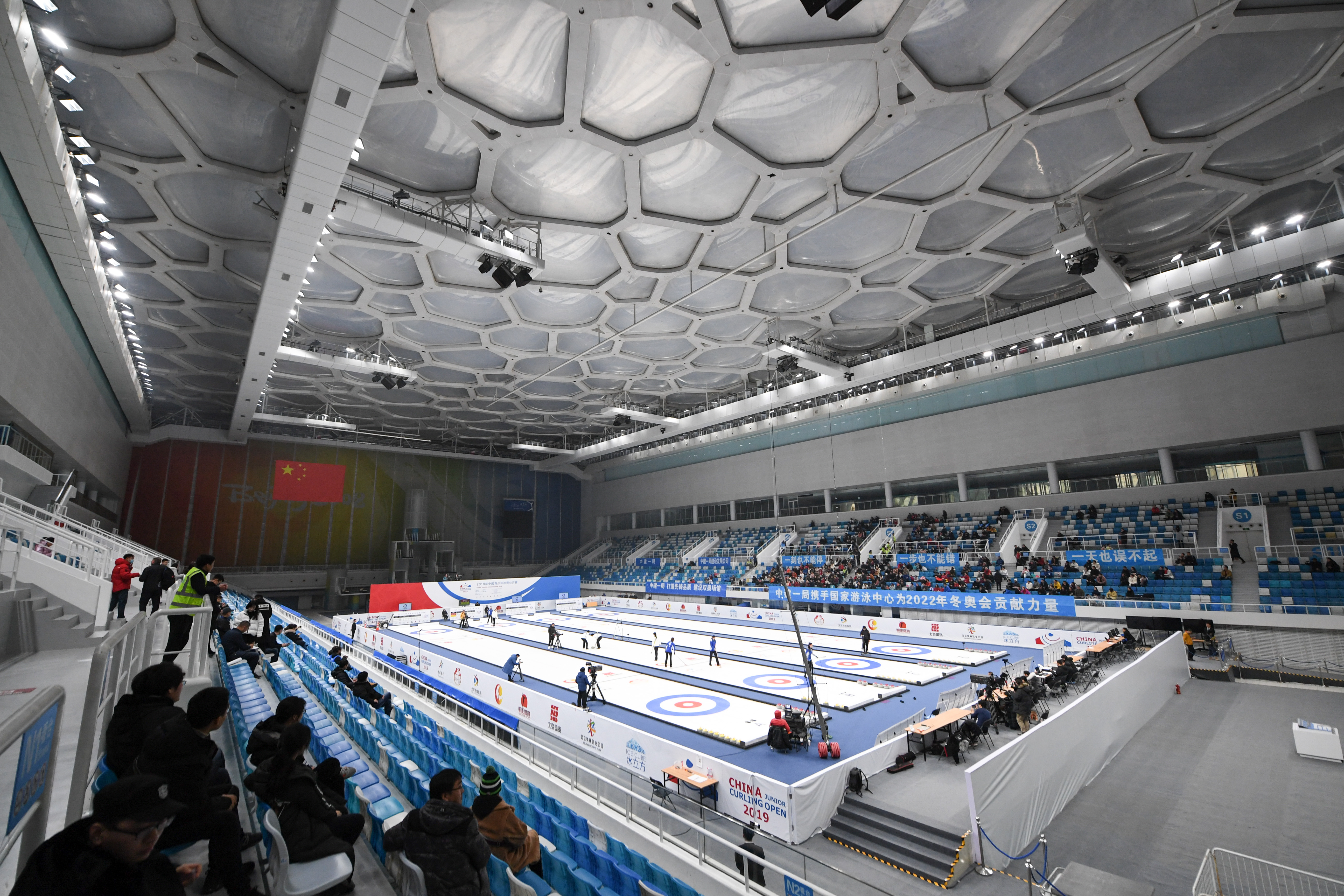 2019年12月8日,观众在“冰立方”观看中国青少年冰壶公开赛女子冰壶决赛。新华社记者鞠焕宗摄