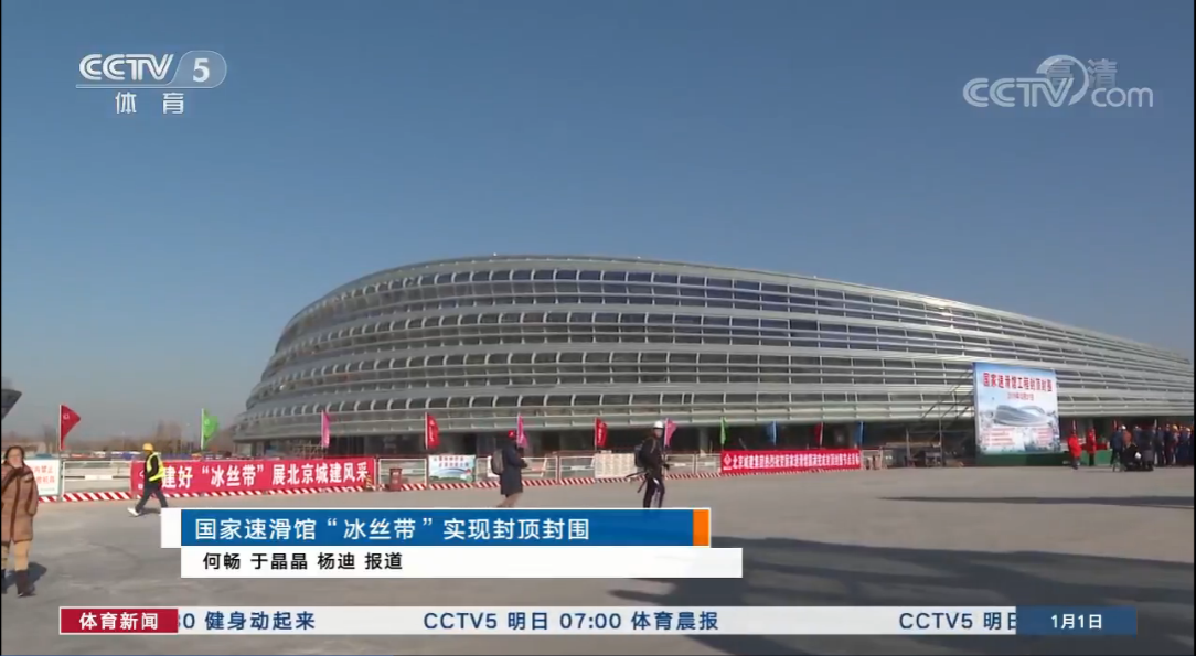 北京时间12月31日,国家速滑馆“冰丝带”实现封顶封围