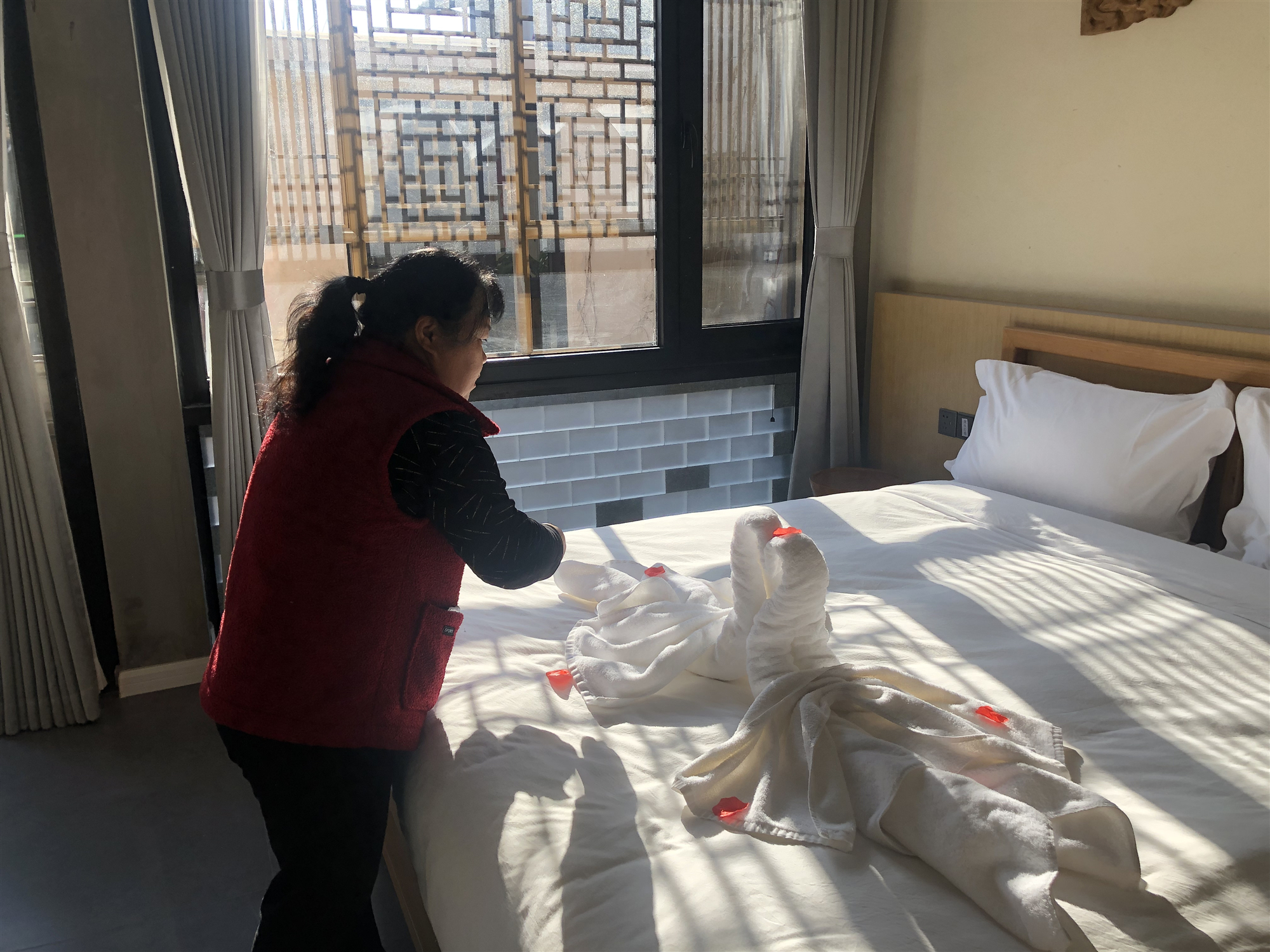 现在的孙荣兴已经是创艺乡居精品民宿管家,经过培训,她已经可以在5分钟内换好床单、被罩、枕芯所有床品,并将毛巾摆出天鹅的造型。